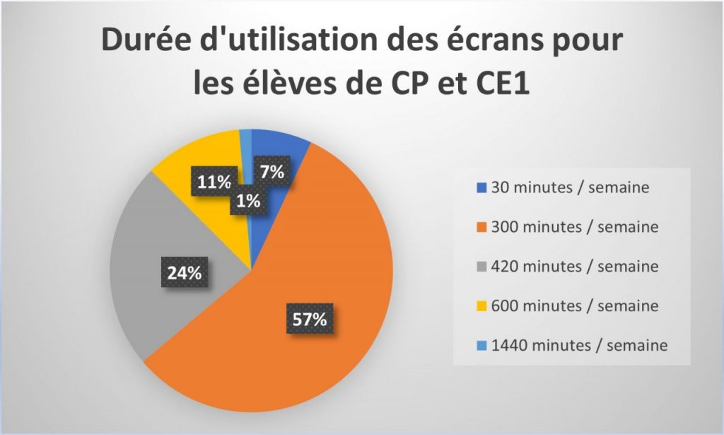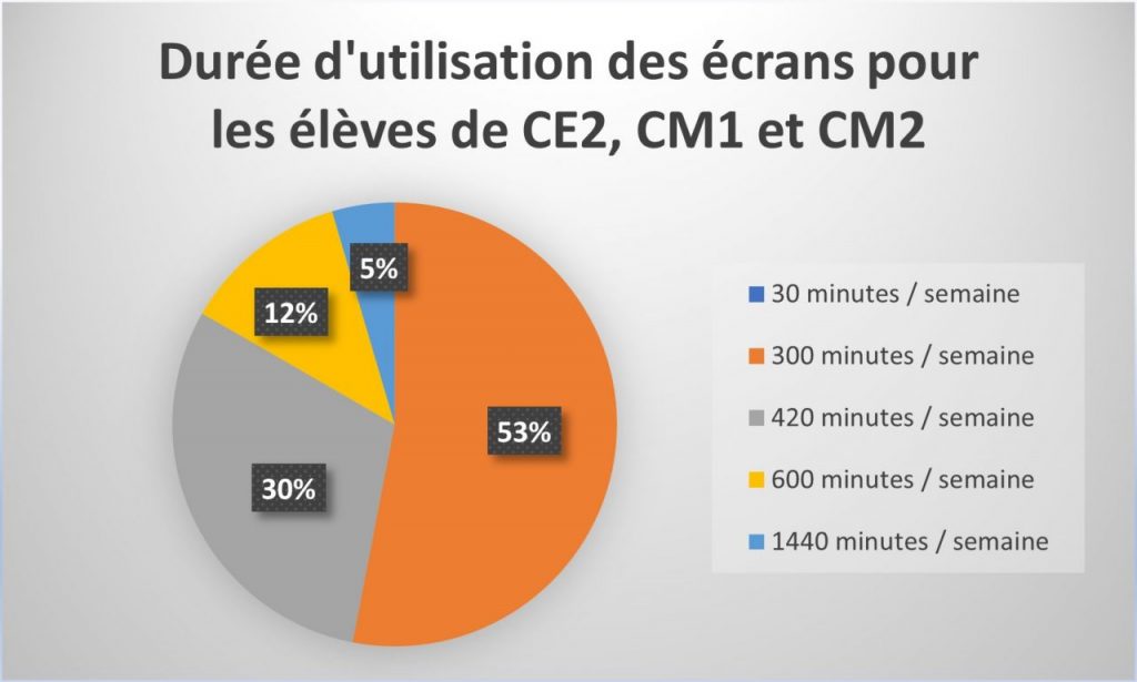 L’objectif était de faire prendre conscience aux élèves de l’impact des écrans sur leur santé (fatigue, vue, développement cérébral, etc.) et l’influence qu’ils ont sur leurs émotions (énervement, peur, humeur changeante, attention…). Les élèves ont quantifié leur “consommation” d’écrans de loisir sur une semaine (graphiques ci-dessous) et ont établi 3 règles d’or individuelles. Les CM2 ont interviewé les intervenants.